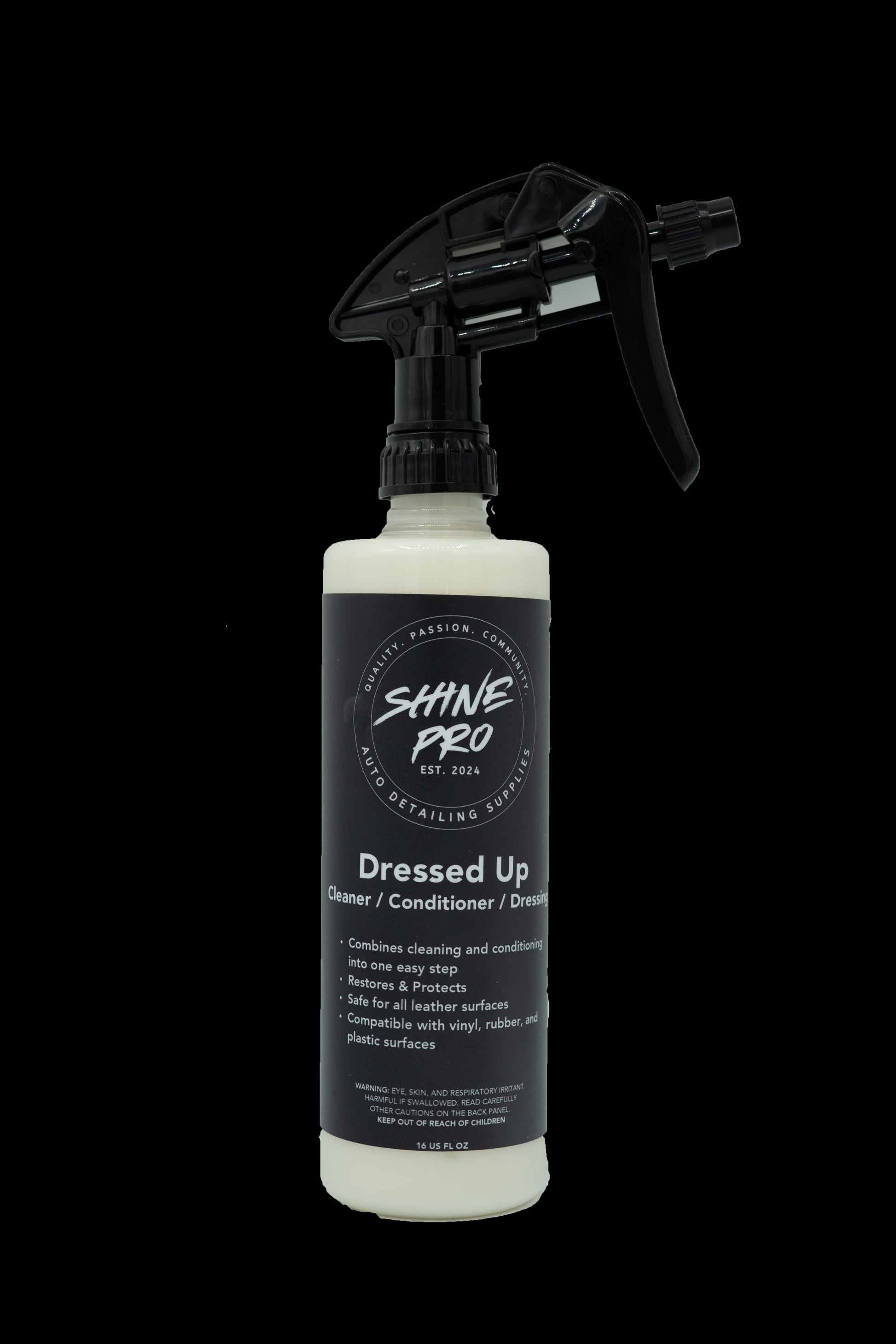 Introducing Dressed Up- our dynamic 3-in-1 leather cleaner, conditioner, and universal dressing combo! Designed to breathe new life into tired leather, vinyl, rubber, or plastic surface, this powerhouse gently cleanses away dirt and grime while simultaneously nourishing and conditioning every pore. Infused with premium ingredients, it penetrates deep to restore suppleness, luster, and resilience to your cherished interior surfaces. Whether it's your seat, dash, door panel, or other interior surface, trust Dressed Up to revive and protect, leaving behind a luxurious finish that stands the test of time.