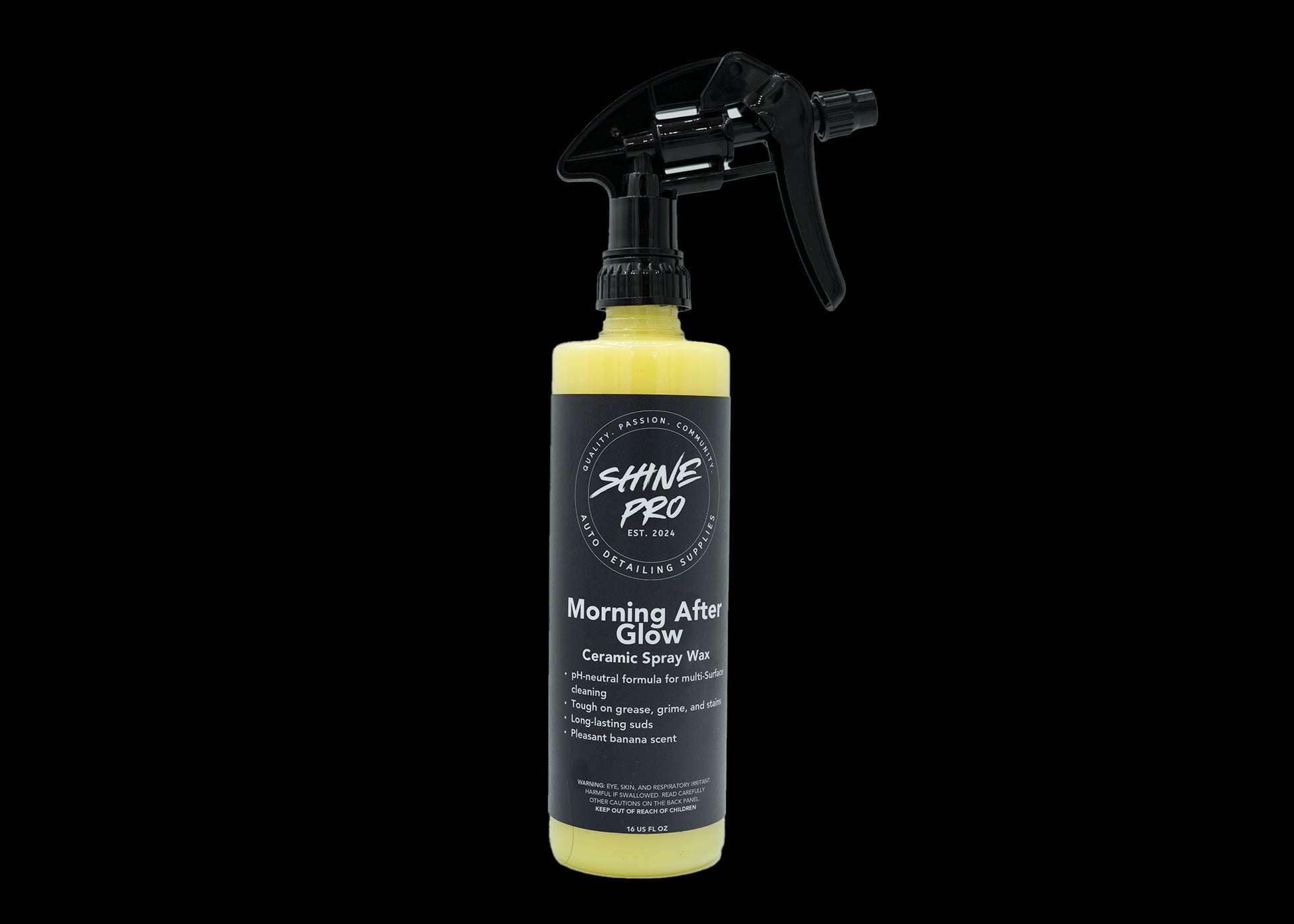Introducing Morning After Glow - ShinePro’s carnuba based, SiO2 infused, spray wax works fast and easy on all wet or dry painted surfaces, clearcoat, plastic, glass, metal, vinyl and rubber trim. Morning After Glow will safely remove dust, mild road grime, fingerprints and mild, early onset water spots. A modern take on a carnauba-based spray detailer, now fortified with SiO2 resins leaving a durable "wet look" shine.
